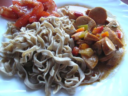 :(Es ist mein Würstchengulasch. Ich habe dran: Paprika, Karotte, Sellerie, Frühlingszwiebeln. Eigentlich sollten noch Tomaten rein, aber ich habe doch lieber Mark genommen und aus den Tomaten Salat gemacht. Dazu gab es Dinkel-Vollkorn-Wellenspätzle. Aber nun ab in die Heia.