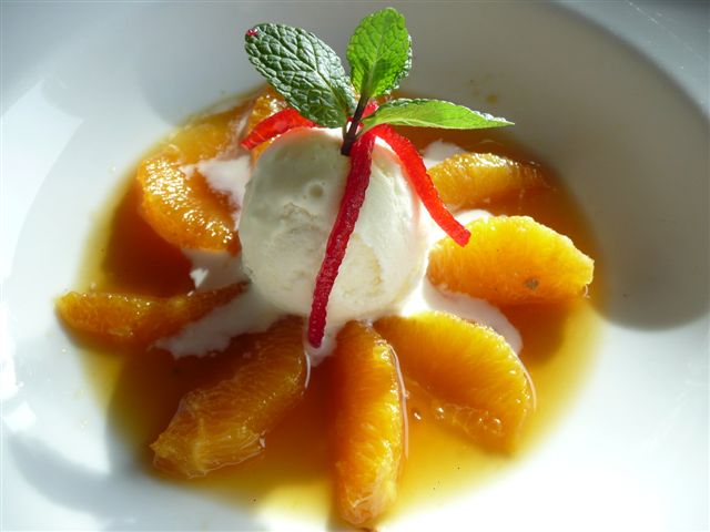 danach Joghurt-Glace mit marinierten Orangenfilets