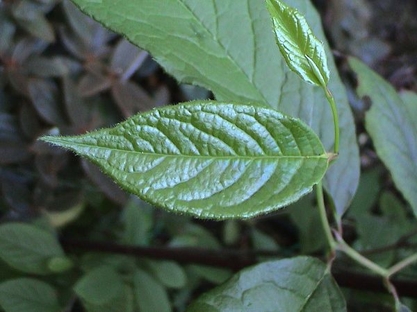 Hier ein paar Fotos der Blätter meines (Klein-)Strauches. Was mich irritiert, ist die feine Behaarung und die weiche Textur der Blätter, sowie deren teilweise Größe (16 cm lang, 6 cm breit). Bei meinen früheren Stewartien hatte ich ein etwas ledriges Blatt in Erinnerung.Allerdings erkenne ich die seidenweiche Rinde wieder, die den St. in ihrem Jugendstadium zu Eigen ist.Die Blattgröße mag mit dem Boden zusammenhängen, da sie in meinem ehemaligen Garten in einem eher sandigen Waldboden standen, während die jetzige in einem schweren Humusboden steht.Helfen deine Bücher weiter, Bernhard.Was die Schönheit der Stewartien betrifft, so kann man nur dankbar sein, dass sie so wenig bekannt ist. Sonst stünden sie in jedem Reihenhaus-Vorgarten.