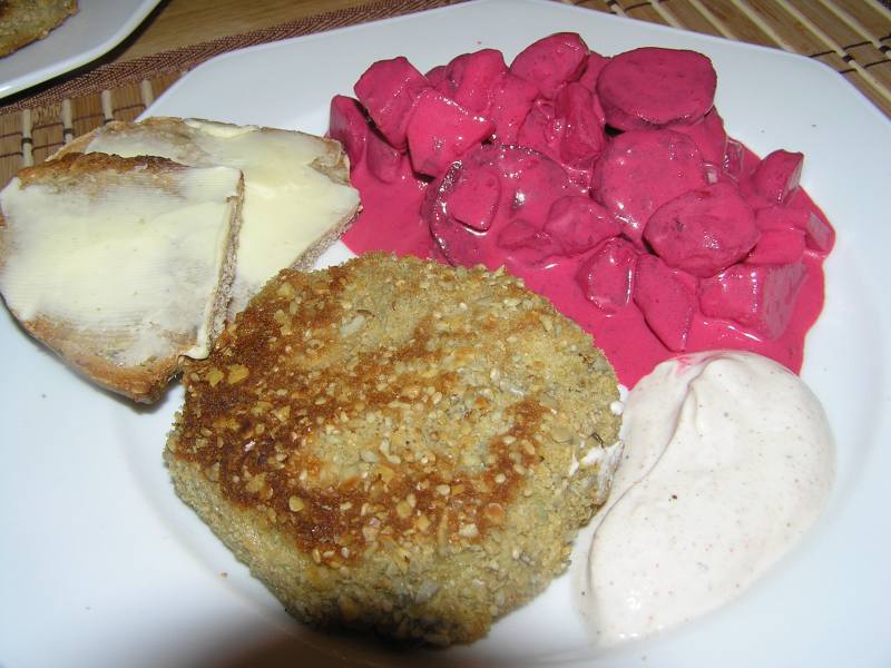 panierter kohlrabi mit einem kartoffel-rote bete-apfelsalat, joghurtdip und eine scheibe butterbrot