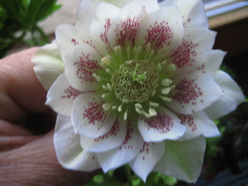 Die guttatus-Dominanz kann ich bestätigen, meine zwei Mutterpflanzen beflecken mir auch ein Gutteil der Sämlinge. Andererseits sind diese Kinder gut zu verschenken, weil "Helleborus-Durchschnittsverbraucher" auf die Gefleckten abfahren.Hier ist nun endlich auch eine Orientalis-Hybride aufgeblüht, war meine erste gefüllte, von Peters. Perfekt ist die Blüte natürlich nicht, was u.a. daran liegt, daß die Pflanze immer schon im Oktober Knospen kriegt und dann über den Winter gebracht werden muß. Aber ich mag die runde Form.