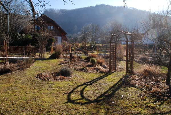 Das Rankgerüst sollen demnächst ein paar Clematis beranken. Jetzt schaut es noch ein wenig einsam aus.