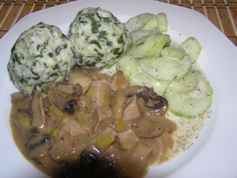 nachtrag von gestern abend:pilzgeschnetzeltes mit spinat-käseknödel und gurkensalat