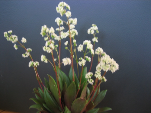 Danke, gartenlady. Ich habe inzwischen auch gegoogelt, aber keine der Kalanchoen, die ich bisher gefunden habe, hat Rosetten.@irisfoolCrassula ovata kenne ich als Geldbaum, und der ist es auch nicht. Seit die Pflanze jetzt dicht neben mir auf dem Schreibtisch steht, merke ich erst, wie sehr die Blüten duften.