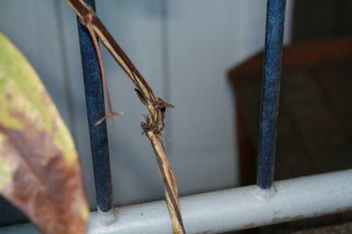 Ich weiß noch nicht, wie man mehrere Fotos auf einmal postet; daher nun das zweite Bild. Es zeigt den Basistrieb (übrigens der einzige Trieb, denn der zweite Trieb, der gebildet wurde, verkümmerte und starb schließlich ab). Auf dem Foto läßt sich genau erkennen, wie filigran die Stelle ist, die die gesamte Pflanze trägt. Meine Sorge ist, dass sie irgendwann brechen könnte.Frank.