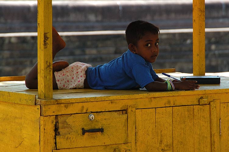 Am nächsten Tag ging es nach Anuradhapura. Hier gibt es eine 2.000-jährige Tradition der Herrschaftssitze und des Landanbaus. Wir kamen früh, die Verkaufsstände waren noch nicht eingerichtet, nur der kleine Junge passte auf...