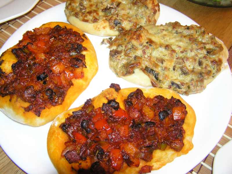 hier gabs gerade..hm..ich nenne es mal "pizzafladen".hefeteig, darauf kam auf die einen eine pilz-speck-zwiebelmasse, auf die anderen eine paprika-oliven-salami-lauchmasse. die wurden dann auf dem pizzastein im ofen gebacken.