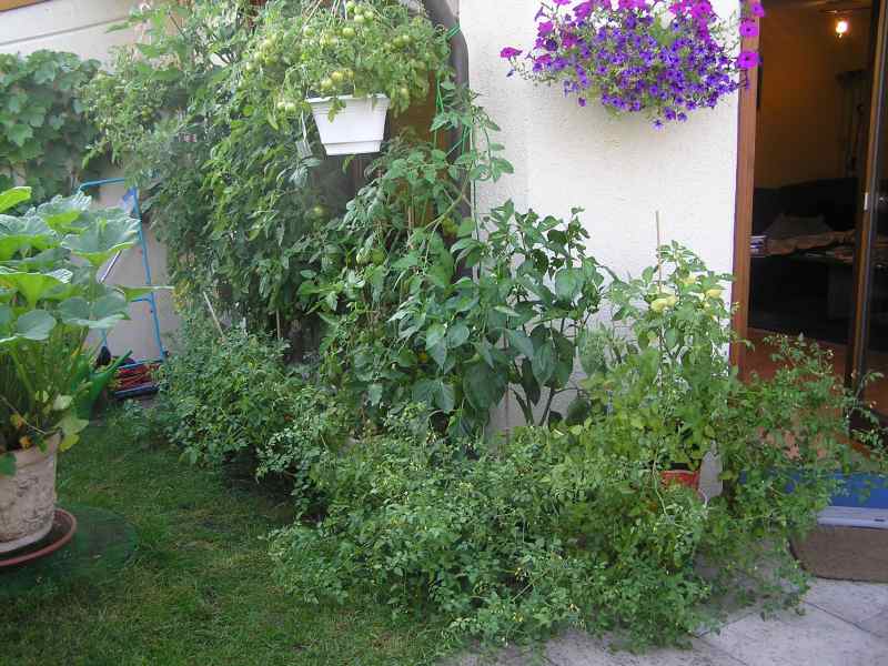 Ja, so wuchert auch meine Johannisbeertomate, aber ich habe deulich kleinere Früchte als auf Deinem ersten Bild (siehe letzte Mitteilung) und je Rispe (sagt man so: "Rispe"?) vielleicht 50 bis 100 (vielleicht auch mehr) Tomätchen. Die Anzahl der Rispen habe ich noch nicht gezählt. Ich lasse sie einfach wachsen.Ich habe diese Tomate von einem bekannten Fachhändler als Pflanze bezogen.Vielleicht ist es etwas anderes. Ein Bild habe ich leider nicht gemacht.Was sagt "Tomatengarten" dazu?Alles GuteSywaund hier ein bild von 2005.ich hatte die johannisbeertomaten mit in die kübel von den normalen tomaten gepflanzt. die triebe wurden viel länger und haben alles zugerankt, so das ich sie am boden entlangleiten musste.auch hier haben sie gut getragen, aber im verhältnis pflanze - ertrag hatte ich im kleinen kübel mehr davon.