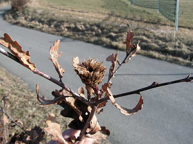 Pardon ... ich schon wieder ... mit einem Phänomen, das ich noch nie gesehen habe ... was allerdings nix heissen soll ;)Werft doch mal bitte einen Blick auf dieses merkwürdige Terminal-Dingens auf dem Eichenzweig.Sieht aus wie eine vertrocknete Distelblüte.Nur - was hat die an der Spitze eines Zweigs von Q.robur zu suchen ?Kann mir einer erklären, was das ist ?Danke
