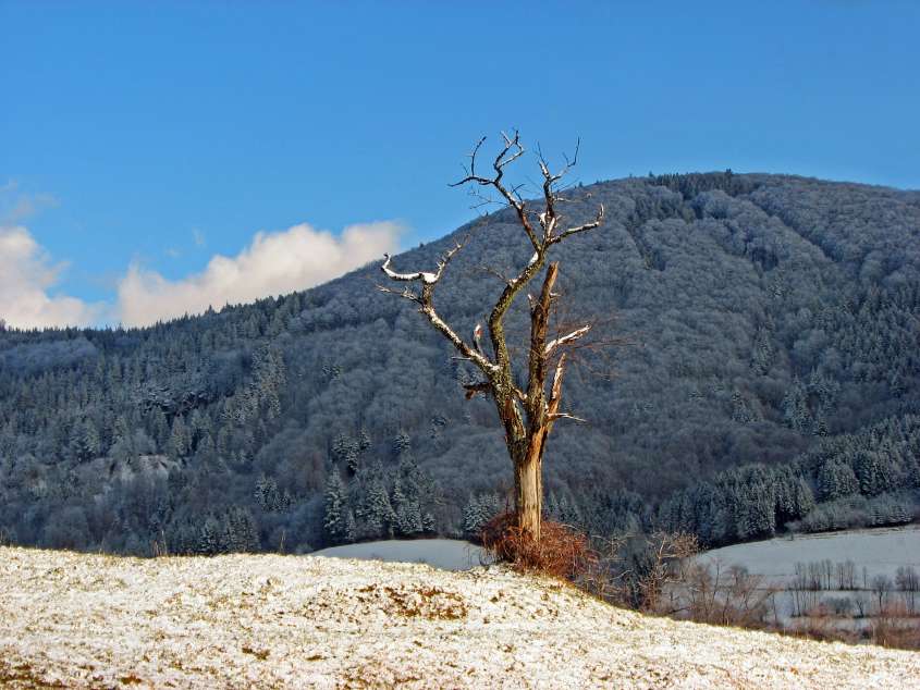 Heute Vormittag war alles grau in grau. Jetzt am Nachmittag kam die Sonne hervor und hat den abgestorbenen Baum in's Licht getaucht.Gruss Christa