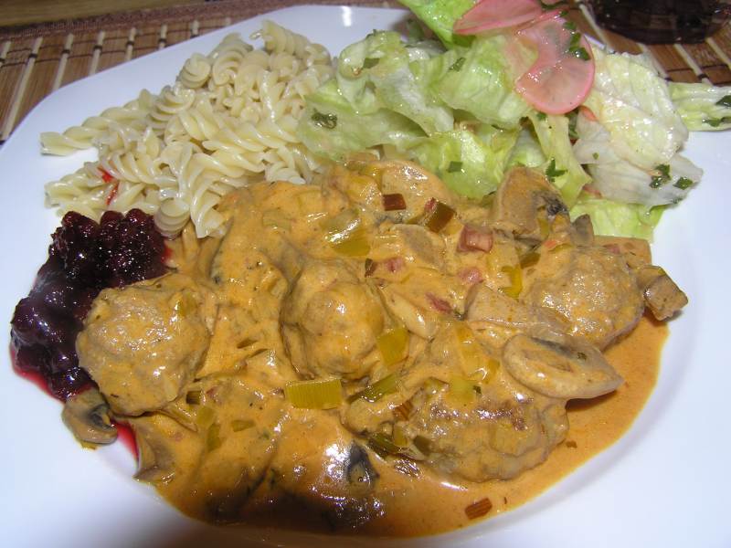 hier gabs gerade hackfleischbällchen in einer pilz-lauchrahmsoße. dazu spirelli und eisbergsalat mit radieschen und den ersten wildkräuterblättchen (giersch, löwenzahn, sauerampfer) aus dem garten.und weil die schweden zu sowas ähnlichem ja preiselbeeren essen, hab ich das heut auch mal probiert. schmeckt vorzüglich dazu