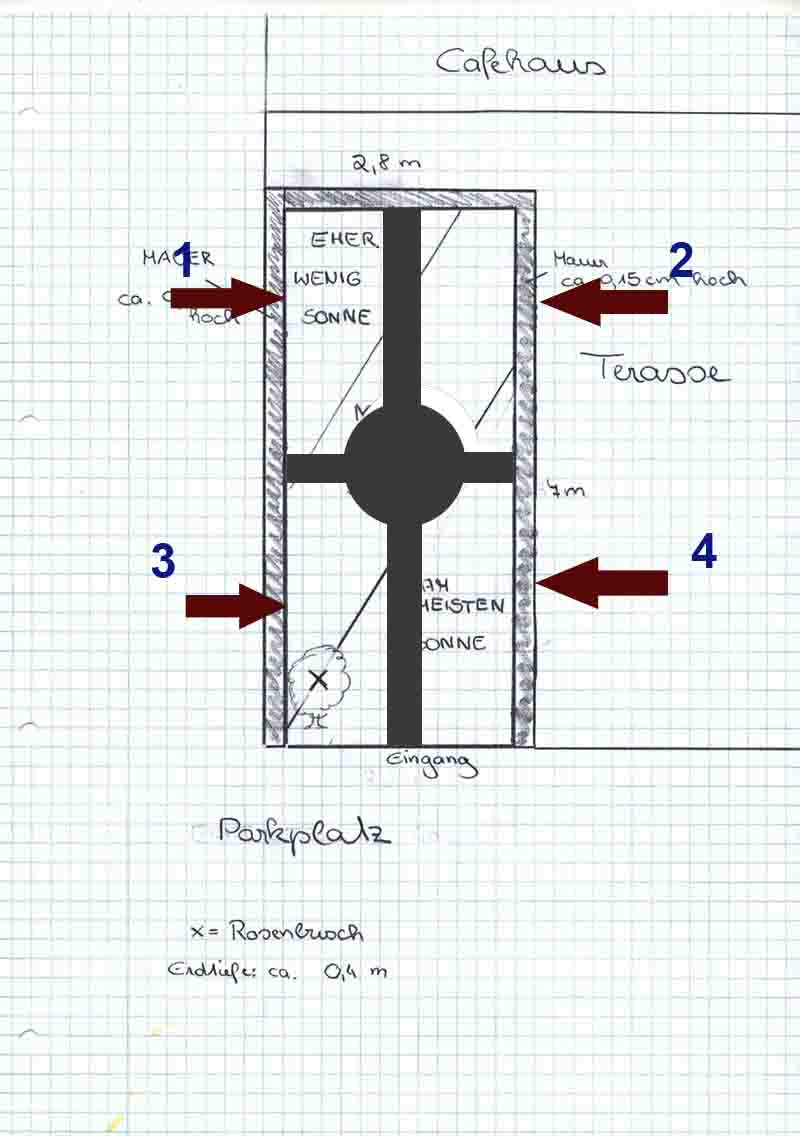 also zuallererst mal: vielen dank für die vielen guten vorschläge!!! :)norden ist im oberen rechten eck der skizze. die hintere mauer ist genau wie die rechte 15 cm hoch.