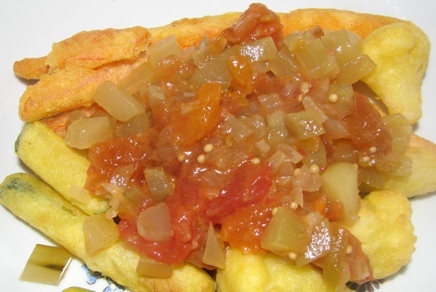 heute war gemuesetag: paniertes und gebackenes gemuese von bofr**t. dazu selbstgemachte gemuesekonserven.variante eins mit gurken-tomaten-chutney.