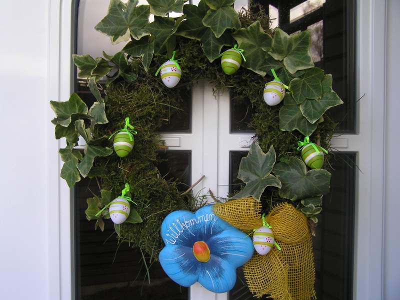 mein türkranz.den kranz selbst habe ich aus stroh und draht geflochten und mit frischem moos umhüllt. etwas efeu dazu und noch ein wenig dekokram. fertig.