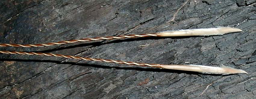 wer das foto genau betrachtet hat, weiß vielleicht, warum ich geschrieben habe "fast" frischen samen. das entscheidende passiert nach einigen stunden, nachdem der samen ausfällt. es hängt wohl mit der luftfeuchtigkeit zusammen. das anfangs gerade drahtige und ungefiederte mittelteil der granne fängt an sich wie ein korkenzieher zu verdrillen.hier ein detail-foto...man beachte die gemeine nadelspitze, die ist hart und nicht etwa weich, wie es die härchen vielleicht vermuten ließen...so schnell schaut man nicht, und die stecken so richtig unter der haut