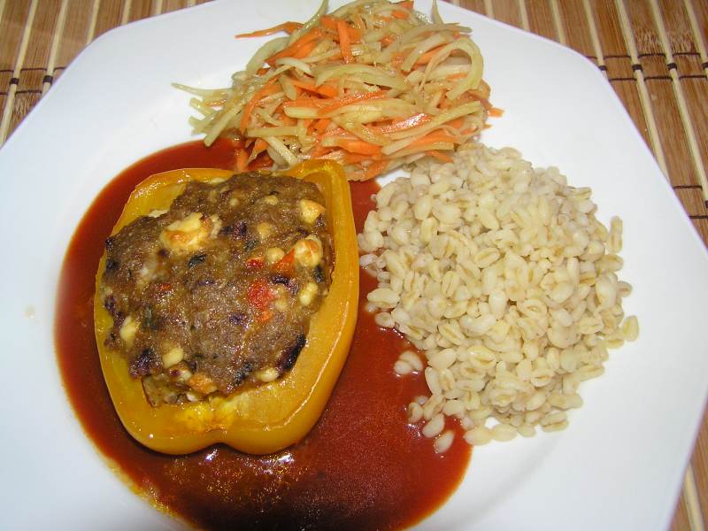 es gab mit schafskäse und hackfleisch gefüllte paprikahälften aus dem ofen.dazu eine tomatensoße, ebly und rohkostsalat aus karotte, kohlrabi und apfel.