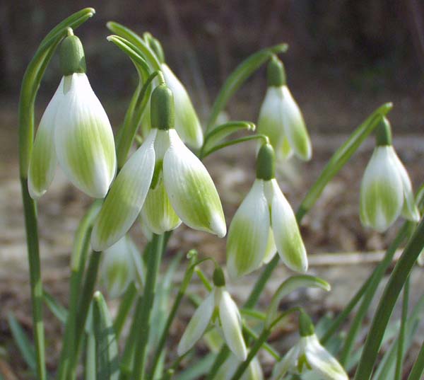 Galanthus nivalis 'Angelina'In Oirlich fiel ein Schneeglöckchen ganz besonders auf. Es war ein Findling meiner Bekannten aus Kroatien. Sogar Joe stand davor und staunte, dass ein G.nivalis solch riesige Blüten mit einer grünen Strichlierung hervorbringt. Wirklich was Herausragendes!