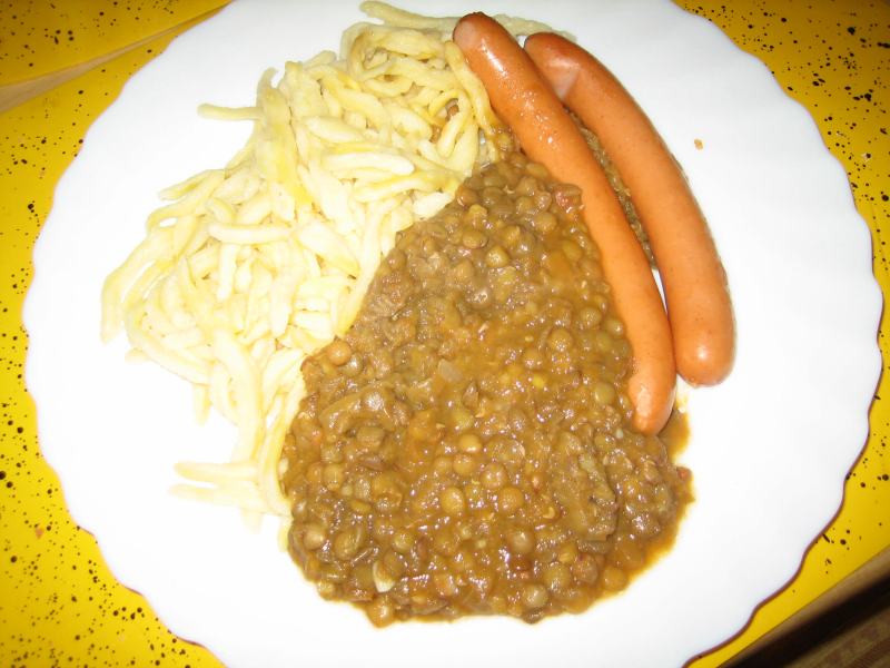 heute gabs allerleieintopf aus erbsen, bohnen, linsen, steckrüben, kartoffeln, karotten, petersilie, hühnerbrühe, bärlauch und würstchen.dazu baguette und karotten-walnussbrot.mhhhh war der guuuut