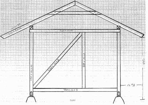 Nun ja, eigentlich wird das Gewicht des Daches von den senkrechten Balken getragen. Die Schrägbalken stabilisieren nur gegen Scherkräfte. Wenn das Gebäude erstmal aus dem Gleichgewicht gebracht wäre, dann würde natürlich auch das Gewicht des Daches eine Rolle spielen, vorher eigentlich nicht.Aber keine Angst, mein Schuppen wird stabil, und es wird nicht an der Tragekonstruktion gespart werden.