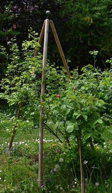 tolle Idee und tolles Teil!Nachdem ein gekaufter Obelisk viel zu eng für New Dawn war, haben wir dieses Holzdreibein gebaut. Die Stangen sind oben mit Gewindestangen und Gewindedübel an der Holzkugel befestigt, je nach Neigung der Bohrlöcher kann die Breite variiert werden. Inzwischen haben wir schon ein zweites Teil gebaut: