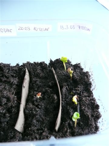 in meiner zweiten Reihe (20.03. Fruchttag) guckt ein "Radieschen" nach gut 3 1/2 Tagen aus der Erde