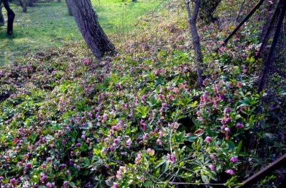 Bei einem Spaziergang bin ich an einem Garten vorbeigekommen, wo Helleborus, offensichtlich über viele Jahre völlig ungestört, einen ganzen Abhang erobert haben.