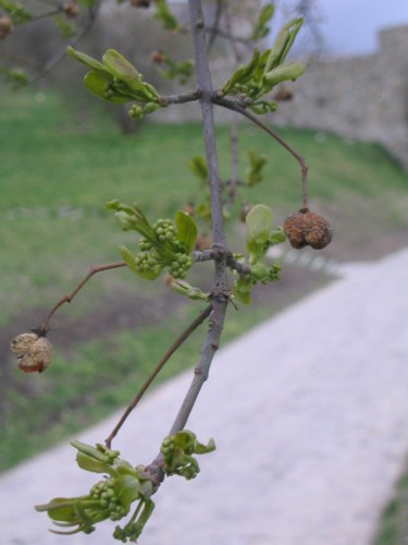 Sieht nach einem Pfaffenhütchen (Euonymus) mit alten Fruchtständen und noch geschlossenen Blütenständen aus.