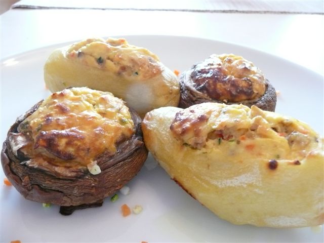 NormandinDie Kartoffel sind roh, in der Füllung hat es Gemüse, getrocknete Tomaten, Frischkäse dieser Art, Eier und etwas Reibkäse, die Kartoffeln brauche etwa 50 Minuten im 180° heissen Ofenwegen dem Ei bräunt die Füllung relativ rasch, darum gebe ich die Kartoffeln mit Alufolie abgedeckt in den Ofen und decke sie erst ca. 15 Minuten vor dem servieren abvor dem füllen die Kartoffeln mit Butter oder etwas Öl einreiben, sonst werden sie beim backen hässlich grau