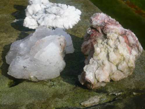 @ bristlecone Die Verwitterungserscheinungen kann man bei den Bildern am besten an den Steinkanten sehen. Beim Marienglas sind die Flächen glatt und glänzend während bei dem weiß- und rosafarbigen die Fläche feinporig rau ist.