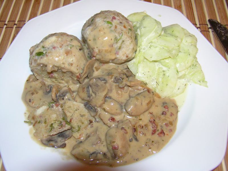 es gab semmelknödel mit pilzrahmsoße, dazu gurkensalat.damit es sich wieder lohnt, gleich mehrere gemacht. 16 stück sinds geworden und die restlichen sind gleich in den tiefkühler gewandert.