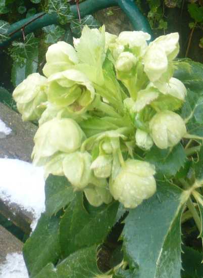 Helleborus argutifolius im Schnee beim heutigen Gang durch meinen Garten