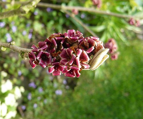 An einer meiner Zaubernüsse sind die nach der Blüte stark geröteten Sepalen sehr auffällig und haben, da der Strauch sehr reich geblüht hat und die Zweige mit den Sepalen stark besetzt sind, durchaus eine Fernwirkung.Offenbar ist das die Besonderheit dieser Züchtung. Oder habt ihr bei anderen Sorten Ähnliches beobachtet?