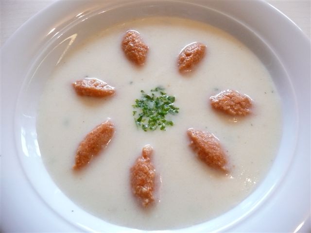 ... heute gab es eine Topinambur-Suppe mit Rauchlachsklösschen, dazu frisches Tomatenbrot