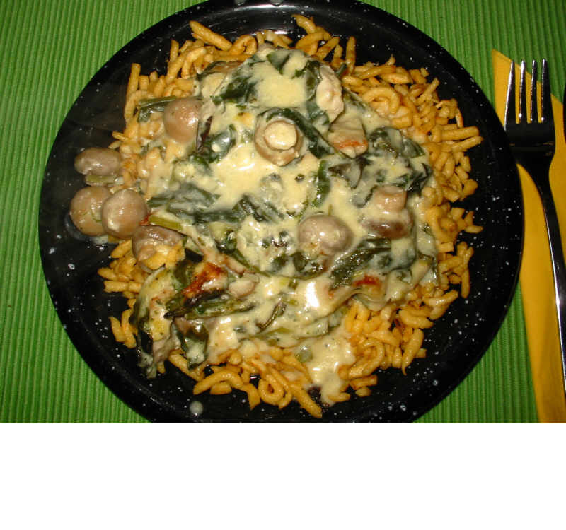 , mein eigener ist noch ganz klein, aber ich bin schon froh, dass er dieses Jahr überhaupt wiederkommt, sogar mit Blüten.Für das Essen vorgestern hab´ ich gekauften genommen, es gab gebratene Spätzle mit einer Putenfilet-Bärlauch-Champignon-Sauce. Gestern gab es einen großen Salat und eine Gemüsesuppe mit Maultaschen. edit: @Natura: warst du das mit dem Algiersalat? Hast du den im Moment selber? Ich hab´ auch Saatgut, ich dachte so als Sommer-Feldsalat. Winteranbau geht auch?