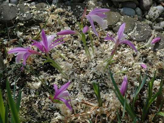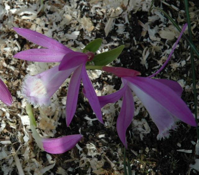 Meine Pleionen blühen wieder draussen. Wie unschwer zu erkennen ist hatten sie Kaninchenstreu als Winterbedeckung, das klappt nun schon das 2. Jahr prima. Darüber hatte ich die Haube eines Minigewächshauses gestülpt. Sie haben sich um das Doppelte vermehrt.
