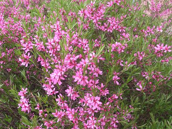 Seit einigen Tagen blüht die Zwergmandel (Prunus tenella). Sie ist nur etwa 1 m hoch und vermehrt sich gut durch Ausläufer. Mandeln habe ich noch nie beobachtet.