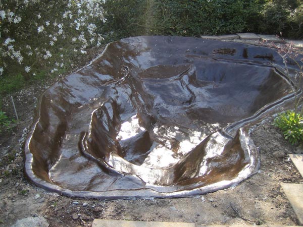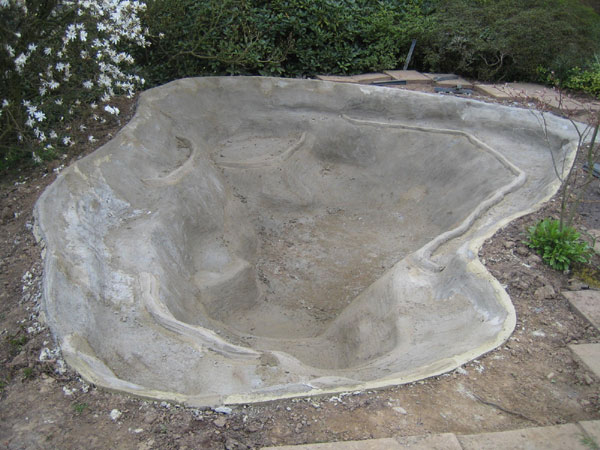 Jetzt sind noch ein paar Wälle eingebaut, damit keine Pflanzen oder Steine abrutschen können. Wenn das Wetter mitspielt, dann geht es am Montag weiter mit der eigentlichen GFK-Beschichtung.