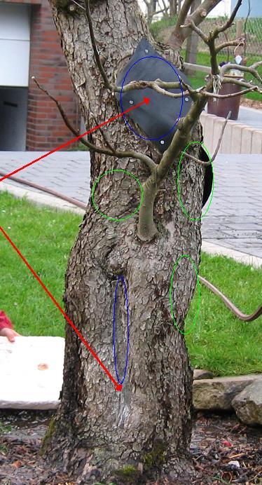 Hallo,anbei ein 2. Bild, wo schematisch die beschädigten Punke farblich dargestellt sind.rote Pfeile --> zwischen diesen Punkten ist der Beton. ca. 1 mblaue Kreise --> offene Schadstellen / sichtbarer Beton von dieser Seitegrüne Kreise --> offene Schadstellen / sichtbarer Beton von der gegenüberliegenden SeiteThema Gerüst: Der Stamm ist soweit rundherum mit Rinde überzogen. Der Baum treib jugendlich und ich baue unten herum neue Äste auf. Die Krone wurde reduziert und stark ausgelichtet. Der Stamm ist aber hohl in einer länge von ca. 1 m und einen Volumen von < 20 Liter.Wenn jetzt "ohne" Beton Hebelwirkungen durch starken Wind auf den Stamm einwirkt, wird er an dieser Stelle knicken. Ein Gerüst müsste also auftretende Kräfte auf den Boden abführen / stützen. Man könnte hierfür ein Dreibein aus Stahlrohren bauen, die oberhalb der geschädigten Bereiche (ab 1,5 m) an den Baum geschraubt würden. Die Füße erhalten Platten, welche sich bei Belastung gegen den Boden stemmen. Man könnte diese unterhalb der Erdoberfläche aufstellen, damit man nur die Rohre sieht. Ist das abwegig, sinnvoll oder? Jetzt muss der Statiker ran!GrußAndreas