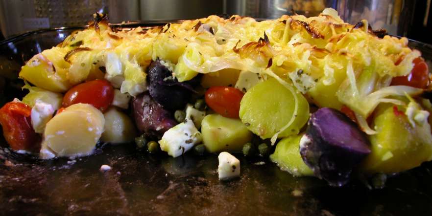 Heute will ich auch mal ein Bild einstellen. Da suchte doch letztens jemand nach weiteren vegetarischen Rezepten.Der Kartoffelauflauf ist mit 5 versch. Kart.sorten gemacht: Selma, Quarta, Vitelotte, Pink fir Apple und Highland Burgundy RedKartoffeln kochen, währenddessen 2 grosse Zwiebeln in dünne Scheiben schneiden, weich dünsten Gekochte Kartoffeln schälen, in Stücke schneiden.Fetakäse würfeln - zu den Kart gebenFrische oder gefrorene Cocktailtomaten (hier Teardrops) dazugebennicht zuwenige Kapern zugebenHerbes de Provence (kein Salz - es ist genug drin durch den Fetakäse)alles vermischt in die Auflaufform geben, obendrüber die gedünsteten Zwiebeln und etwas geriebenen Käseca 30min in den Ofen bei 200°CLG, Bea