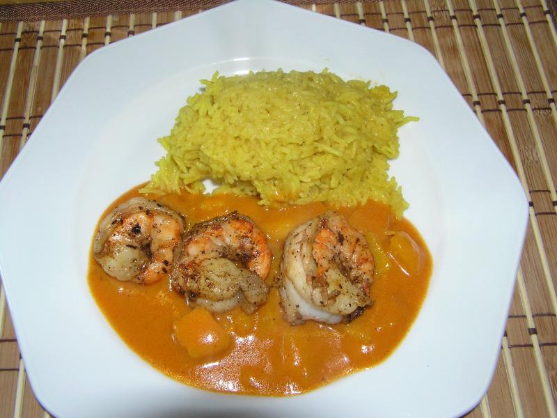 es gab gebratene garnelen an einer feurigen mangosoße mit curryreis
