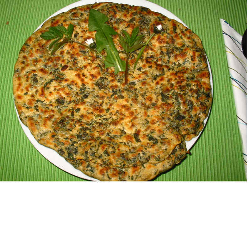 Und heute dazu ein Hefe-Pfannenbrot mit Wildkräutern (Brennesseln, Giersch, Löwenzahn und Gänseblümchen) und zahmem Knofi, das mach ich wieder, auch gut zu Gegrilltem....oder einem Klacks saure Sahne.....