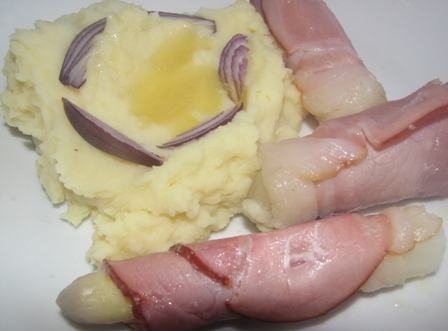 heute gab es schinkenspeck-roellchen, gefuellt mit spargelspitzen.