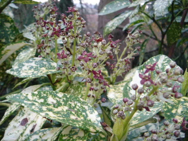 Und bei Aucuba japonica 'Sulphurea Marginata' habe ich diese Früchte entdeckt. Ich glaube die sind schon einige Zeit da. Wann werden die eigentlich gebildet ,im Winter?