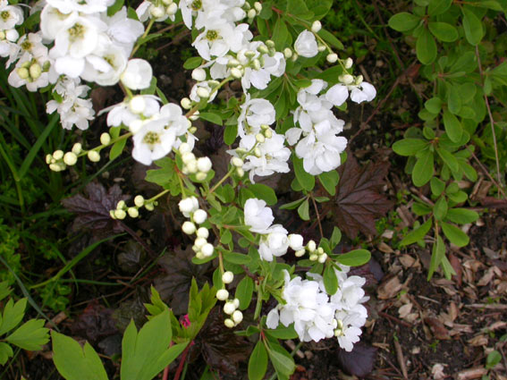 Etwas früher hat der Blütensturm bei Exocorda macrantha 'The Bride' eingesetzt. Sie ist so üppig, daß man den überhängenden Wuchs kaum erkennt.