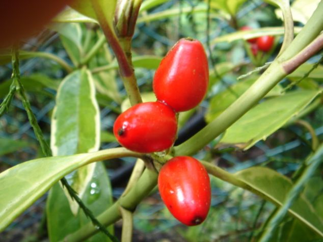 Und bei Aucuba japonica 'Sulphurea Marginata' habe ich diese Früchte entdeckt. Ich glaube die sind schon einige Zeit da. Wann werden die eigentlich gebildet ,im Winter?