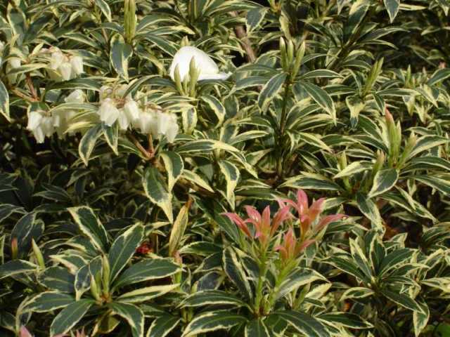 Mein auffallendstes Gehoelz im April ist jedes Jahr die Pieris japonica. Erst bringt sie diese kleinen, maigloeckchenartigen Blueten...