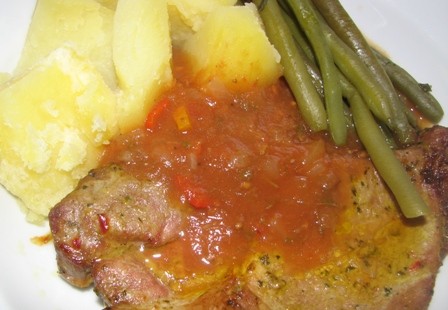 Bei uns:Schweinefilet mit Apfel-Fenchel-Majoran-Knoblauchgrün-Liebstöckelsoße. Dazu in Butter geschwenkte Pellkartoffeln mit frisch geschnittenem Schnittlauch und als Gemüse Grünspargel auf angebräunten Champignons. Der Nachtisch: Rhabarberkompott mit Schlagsahne, ein Pfirsisch-Likörchen und schließlich ein Espresso im Sonnenuntergang.Viele Grüße von Jojo