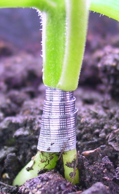 Bei einer Pflanze habe ich die Bleifolie abgemacht, da sie sich schon richtig in den Melonenstängel geschnitten hatte.. Sieht aus, als wenn das nur zusammenklebt