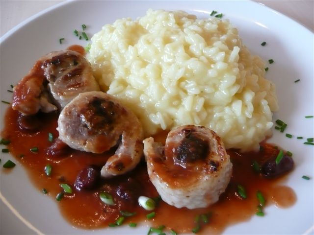 Heute gab es erst einen Blattsalat, danach Poulet-Röllchen, gefüllt mit Pflaumen an einer fruchtigen Tomatensauce, Risotto