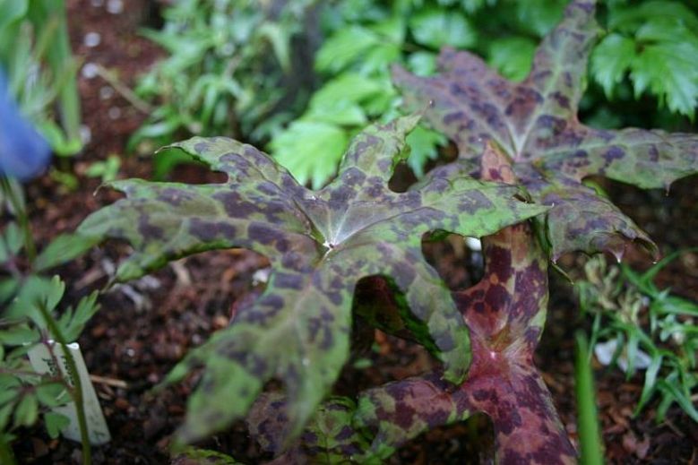 @nina + quercusso sieht mein podophyllum 'spotty dotty' aus. denke da steckt delavayi als elternteil mit drin. bei deinen nina ist ja die blattform schon anders. wahrscheinlich kursieren unterschiedliche hybriden. bei der blattform deines grünfarbenen könnte p. pleianthum oder versipelle mitgemendelt haben. wenn der schirm asymetrisch ist (erkenne das auf deinem foto nicht) vielleicht gar p. difforme. shaw beschreibt einen hybriden zwischen delavayi x difforme, der hat grüne blattschirme "pigmented with mottled green and browns". leider zeigt die abbildung im buch hauptsächlich die blüten + die blätter sind seitlich bzw. von unten aufgenommen. klarheit gibt's vieleicht wenn deiner mal blüht nina. die blüten sind knallrot + groß wie bei delavayi.